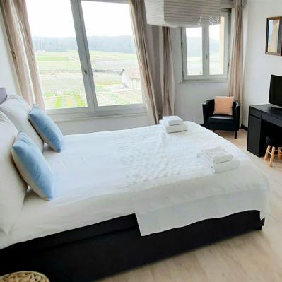 À l'Auberge de Duillier, nous vous proposons 20 chambres d'hôtel avec vue plongeante sur le coteau, les Alpes et le lac Léman. Les voyageurs venus pour affaires apprécient l'atmosphère paisible de notre établissement situé au cœur du vignoble de La Côte. Notre hôtel-restaurant se trouve à mi-chemin entre Genève et Lausanne, à seulement cinq minutes de Gland et de Nyon.